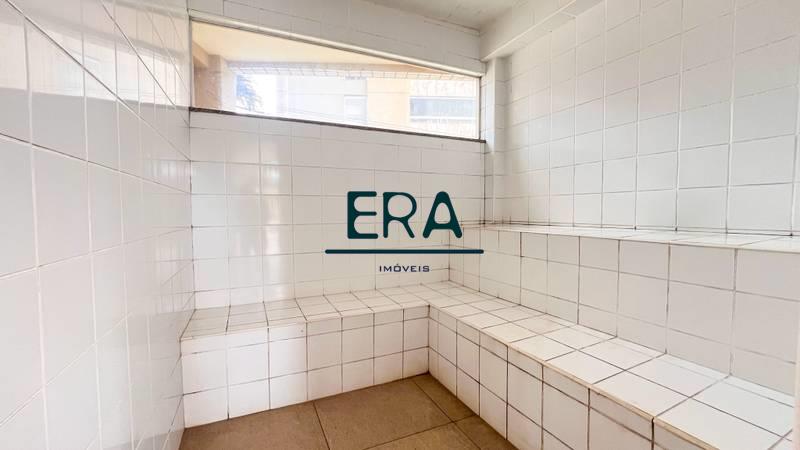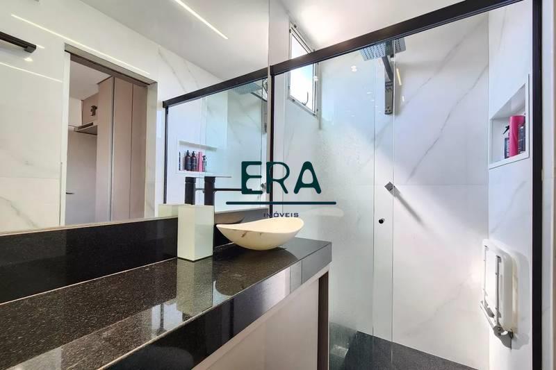 Banheiros (social e suíte) com excelente acabamento, armários, espelho e box em vidro blindex.